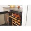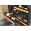 Встраиваемые холодильники для вина оснащаются специальной системой вентиляции: охлаждающая система у них находится в нижней части корпуса спереди. На такие устройства не навешивается мебельный фасад: дверца с затемненным стеклом остается на виду и открывается на достаточно широкий угол для свободного выдвижения деревянных полок.