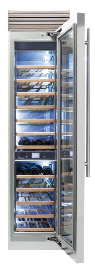 Винный холодильник Fhiaba XS450FW6 имеет две температурные зоны, в которых одновременно можно хранить разные сорта алкоголя и выставлять разные сочетания настроек. Он встраивается в нишу, что удобно, если у вас ограничен метраж помещения. Количество бутылок, которое можно разместить с учетом полной комплектации и из расчета объема бутылки 0,75 л, — 52 шт.