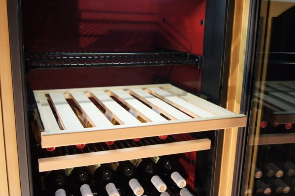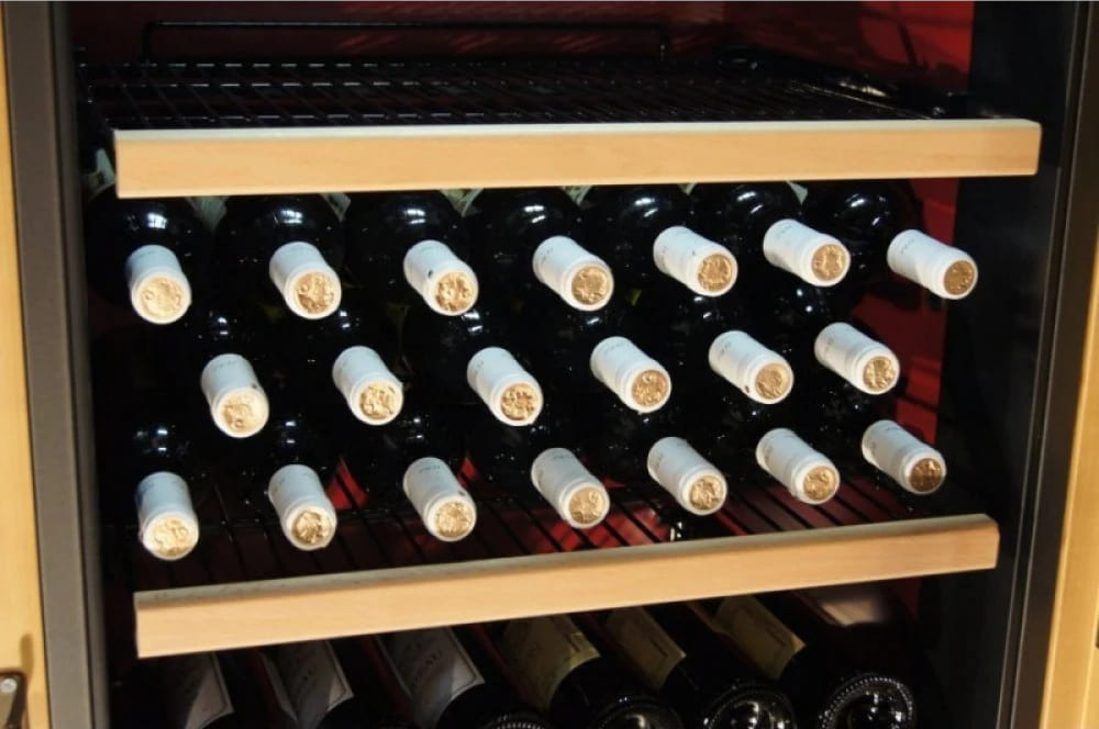 Полки в винных шкафах позволяют размещать бутылки для хранения в горизонтальном положении. Это необходимо, чтобы пробка постоянно смачивалась жидкостью и не пересыхала. Плотно закрытая пробка гарантирует, что внутрь бутылки не проникнет наружный воздух. Кислород, содержащийся в воздухе, может стать причиной ухудшения вкуса вина и даже его скисания. Кроме того, горизонтальное положение позволяет лучше оценить количество осадка. Материал изготовления полок выбирается, исходя из требований, предъявляемых к содержанию коллекции вин. Одним из основных требования является отсутствие или максимальное сокращение вибрации и хорошая фиксация бутылок на месте хранения. Даже если полка выдвигается, бутылки должны оставаться на своем месте. Второе требование исключает применение стеклянных полок, как в обычном холодильнике: на них почти невозможно зафиксировать бутылки.