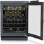 Дизайн продуман под мебельный интерьер: дверь рассчитана под навесной фасад и имеет стеклопакет в черной рамке для стильной демонстрации содержимого. Внутренние полки из металла и дерева сочетают долговечность и эстетическое тепло натуральной фактуры. Четыре выдвижных полки на телескопических направляющих облегчают доступ к бутылкам и минимизируют риск их смещения при извлечении. LED-подсветка с плавным изменением яркости создает удобную экспозицию и мягко подсвечивает этикетки.
