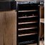 Встраиваемые холодильники для вина оснащаются специальной системой вентиляции: охлаждающая система у них находится в нижней части корпуса спереди. На такие устройства не навешивается мебельный фасад: дверца с затемненным стеклом остается на виду и открывается на достаточно широкий угол для свободного выдвижения деревянных полок.