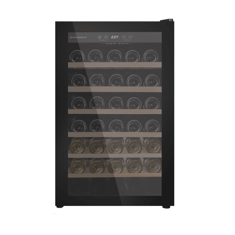 Винный шкаф Maunfeld MFWC-118S40 — компактный и стильный прибор в черном цвете, который легко впишется в современный интерьер кухни или гостиной. Его габариты 86×48×57,5 см делают устройство удобным для установки как отдельно стоящим элементом, так и в нише с запасом свободного места для вентиляции. Стеклопакет двери с тонировкой и скрытая ручка придают фасаду лаконичность и защищают содержимое от лишнего света.