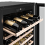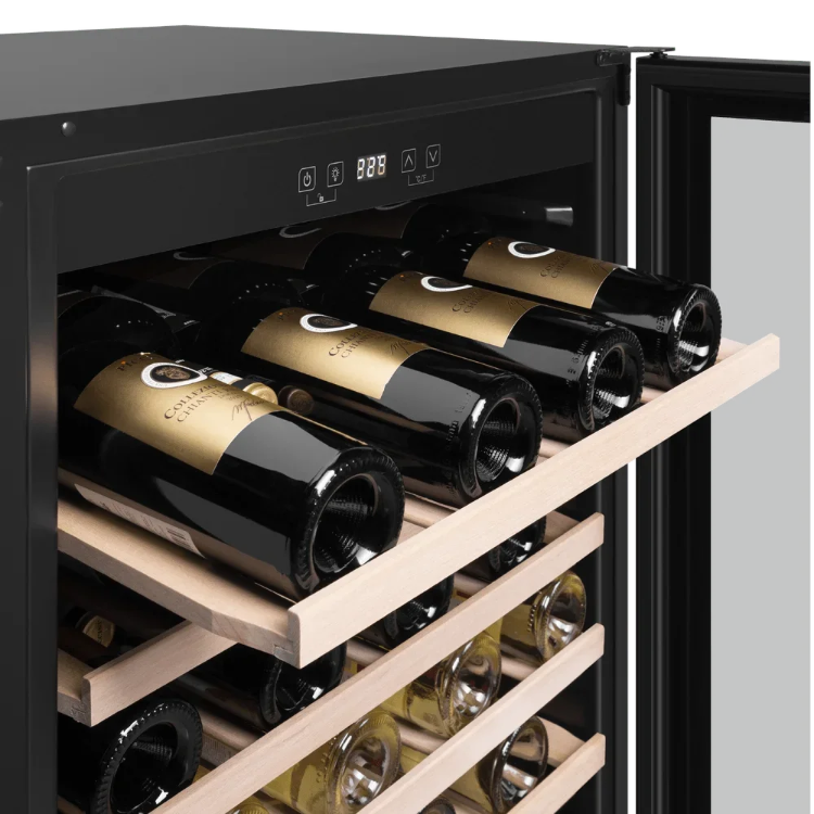 Внутренняя компоновка рассчитана на коллекцию до 40 стандартных бутылок 0,75 л и полезный объем 118 литров. Шесть полок из бука аккуратно размещают бутылки в несколько рядов, снижая риск скольжения и обеспечивая красивую экспозицию. LED-освещение мягко подсвечивает содержимое, не выделяя лишнего тепла, поэтому свет не влияет на температуру в шкафу.