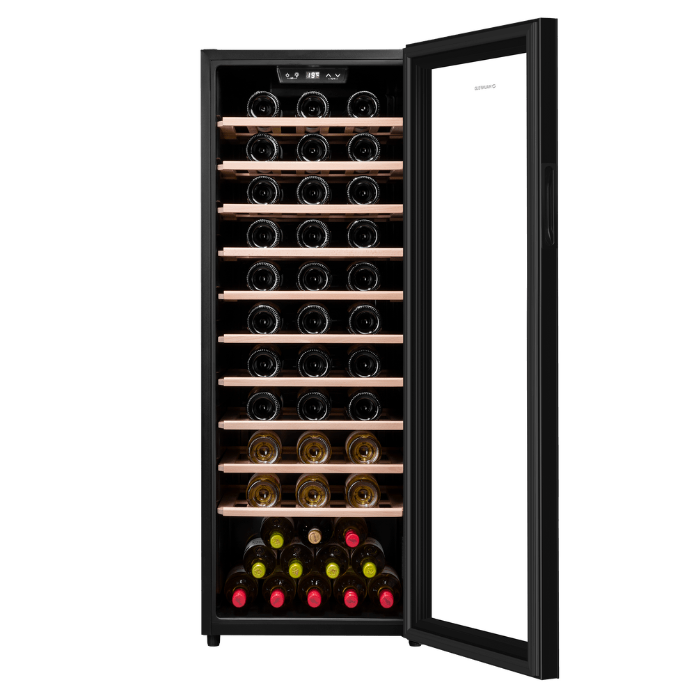 Производители предлагают винные шкафы, оснащенные одной, двумя, тремя и четырьмя камерами, которые могут располагаться как друг под другом, так бок и бок. Самые популярные — однокамерные модели, ассортимент которых особенно широк, но втором месте — двухкамерные. Над заметить, что количество камер не зависит напрямую от габаритов изделия: например, однокамерные модели увеличенных габаритов — далеко не редкость. Их высота может варьироваться в пределах от 14 см до 219 см, а ширина — от 13 см до 150 см.