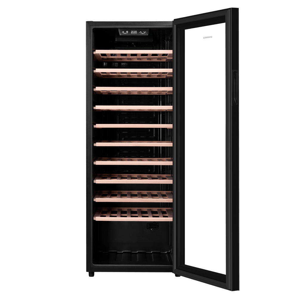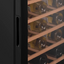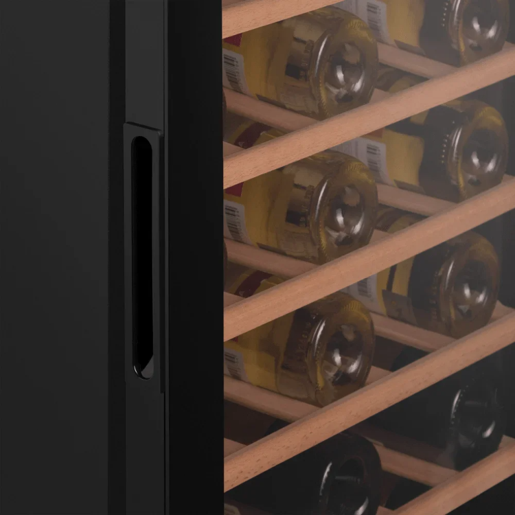 Внутреннее пространство на 201 литр рассчитано на 84 бутылки стандартного объема 0,75 л, что делает шкаф подходящим для частных коллекций и небольших заведений. Десять полок из бука придают оформлению теплоту и натуральную текстуру, одновременно мягко фиксируя бутылки. Светодиодное освещение равномерно подсвечивает содержимое, не нагревая его и не искажая оттенки вина. Встроенная вентиляция поддерживает циркуляцию воздуха и помогает избежать застойных зон.
