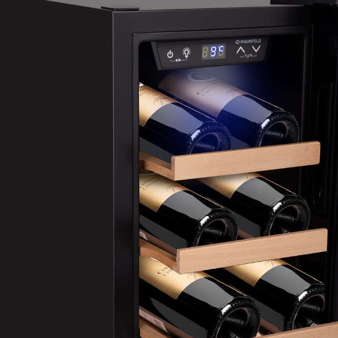 Большинство современных винных шкафов имеет электронное управление, они могут оснащаться обычными цифровыми дисплеями, на которых будет отображаться минимум информации — о включении, температуре в камере и возникших неисправностях. Однако в большинстве моделей используются текстовые сенсорные дисплеи из нескольких сегментов. С помощью кнопок сенсорного меню на этих дисплеях можно отображать и регулировать температуру в каждой зоне отдельно с точностью до градуса, выбирать уровень влажности, задавать дополнительные опции — отключение сигнализации, включение вентиляции и внутреннего освещения, активацию защиты от детей, тип отображения температуры ºF/ºC. Здесь же будут появляться коды ошибок, выданные системой обнаружения неисправностей.