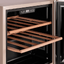 Встраиваемые холодильники для вина оснащаются специальной системой вентиляции: охлаждающая система у них находится в нижней части корпуса спереди. На такие устройства не навешивается мебельный фасад: дверца с затемненным стеклом остается на виду и открывается на достаточно широкий угол для свободного выдвижения деревянных полок.