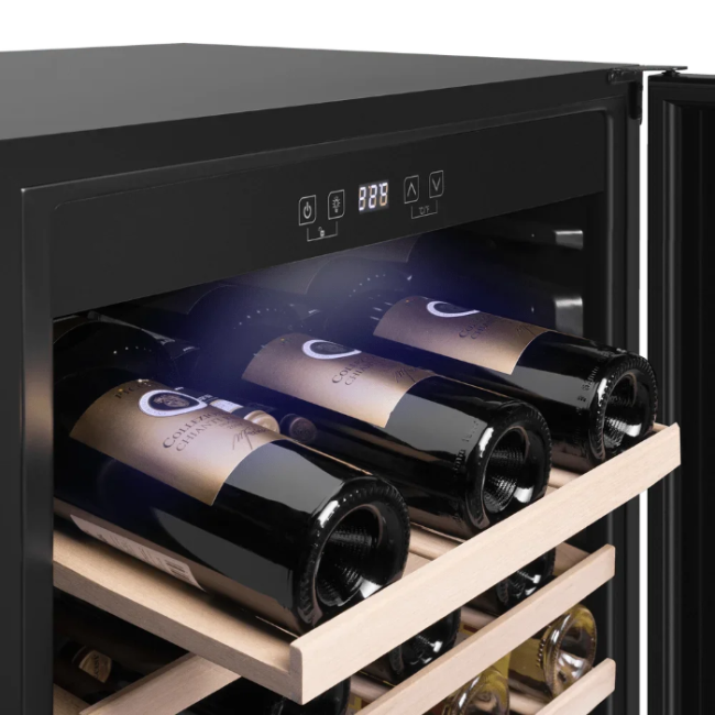 Стеклянная дверь — дополнительный изящный штрих к общему дизайну модели. Специальное покрытие защищает вино от влияния ультрафиолетовых лучей, которые проникают, если шкаф находится в солнечной комнате. Цвет корпуса — черный.