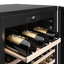Внутреннее пространство рассчитано на 18 стандартных бутылок 0,75 л при полезном объеме 52 литра. Четыре полки из бука аккуратно располагают тары и придают интерьеру теплоту натуральной древесины. Дерево мягко гасит вибрации, что важно для сохранности пробок и медленного созревания напитков. Встроенная светодиодная подсветка равномерно освещает содержимое, не нагревая его и не нарушая микроклимат.