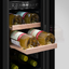 Встраиваемые холодильники для вина оснащаются специальной системой вентиляции: охлаждающая система у них находится в нижней части корпуса спереди. На такие устройства не навешивается мебельный фасад: дверца с затемненным стеклом остается на виду и открывается на достаточно широкий угол для свободного выдвижения деревянных полок.