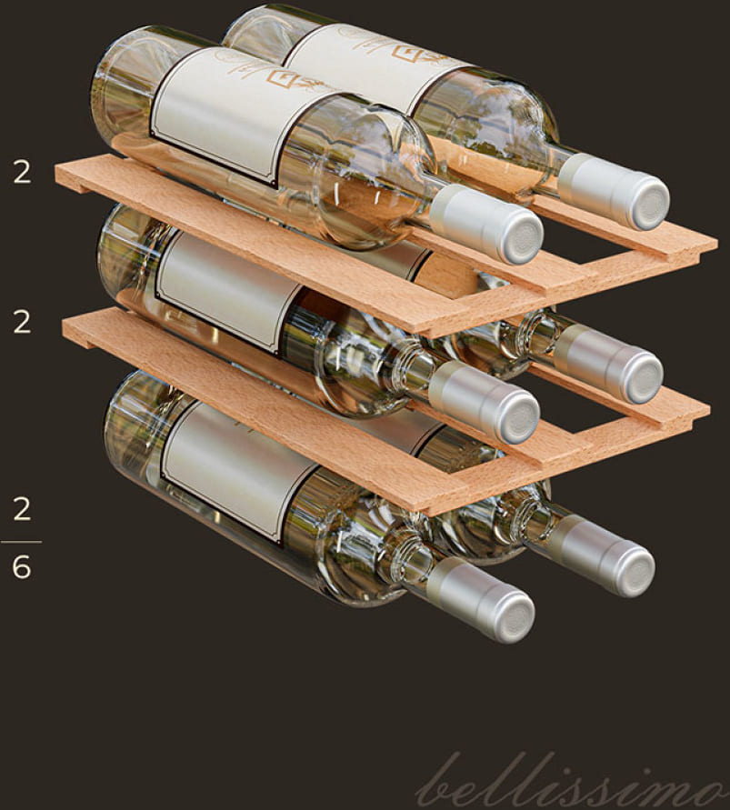 Полки в винных шкафах позволяют размещать бутылки для хранения в горизонтальном положении. Это необходимо, чтобы пробка постоянно смачивалась жидкостью и не пересыхала. Плотно закрытая пробка гарантирует, что внутрь бутылки не проникнет наружный воздух. Кислород, содержащийся в воздухе, может стать причиной ухудшения вкуса вина и даже его скисания. Кроме того, горизонтальное положение позволяет лучше оценить количество осадка. Материал изготовления полок выбирается, исходя из требований, предъявляемых к содержанию коллекции вин. Одним из основных требования является отсутствие или максимальное сокращение вибрации и хорошая фиксация бутылок на месте хранения. Даже если полка выдвигается, бутылки должны оставаться на своем месте. Второе требование исключает применение стеклянных полок, как в обычном холодильнике: на них почти невозможно зафиксировать бутылки.