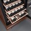 Электронное управление помогает быстро разобраться в том, как функционирует эта модель, и легко настроить все необходимые параметры. На дисплее отображаются данные, которые собирают датчики в камере. Лампочки, расположенные внутри, хорошо подсвечивают бутылки. Всего полок, на которых можно разместить коллекцию, в шкафу 14 шт.