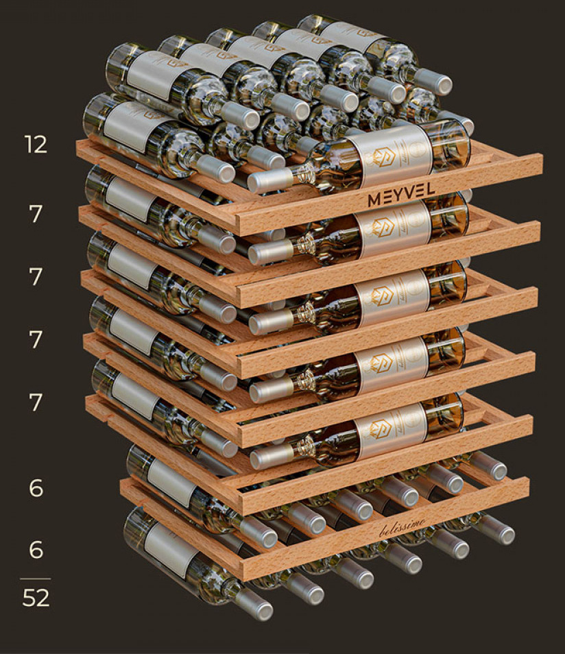 Полки в винных шкафах позволяют размещать бутылки для хранения в горизонтальном положении. Это необходимо, чтобы пробка постоянно смачивалась жидкостью и не пересыхала. Плотно закрытая пробка гарантирует, что внутрь бутылки не проникнет наружный воздух. Кислород, содержащийся в воздухе, может стать причиной ухудшения вкуса вина и даже его скисания. Кроме того, горизонтальное положение позволяет лучше оценить количество осадка. Материал изготовления полок выбирается, исходя из требований, предъявляемых к содержанию коллекции вин. Одним из основных требования является отсутствие или максимальное сокращение вибрации и хорошая фиксация бутылок на месте хранения. Даже если полка выдвигается, бутылки должны оставаться на своем месте. Второе требование исключает применение стеклянных полок, как в обычном холодильнике: на них почти невозможно зафиксировать бутылки.