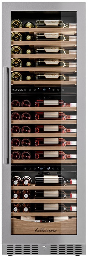 Для длительного сохранения установленных параметров в винных шкафах Meyvel используется дверца с многослойным остеклением. Такое решение позволяет удерживать холод внутри камеры вне зависимости от температуры в помещении, а также сохранить температуру при отключении электроэнергии.