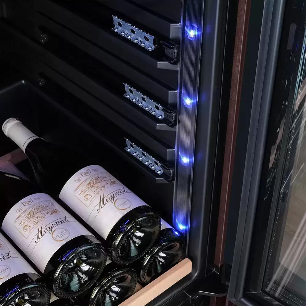 Кнопки для управления подсветкой выносятся на панель управления. Лампы синего, белого или голубого цветов могут располагаться в верхней части камеры или на боковых сторонах. Дополнительное освещение может устанавливаться в винных холодильниках с зоной для сервировки: она обеспечивает лучший обзор и доступ при подготовке вина к подаче.