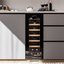 Встраиваемые холодильники для вина оснащаются специальной системой вентиляции: охлаждающая система у них находится в нижней части корпуса спереди. На такие устройства не навешивается мебельный фасад: дверца с затемненным стеклом остается на виду и открывается на достаточно широкий угол для свободного выдвижения деревянных полок.