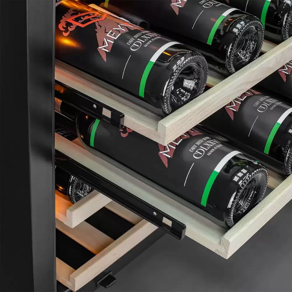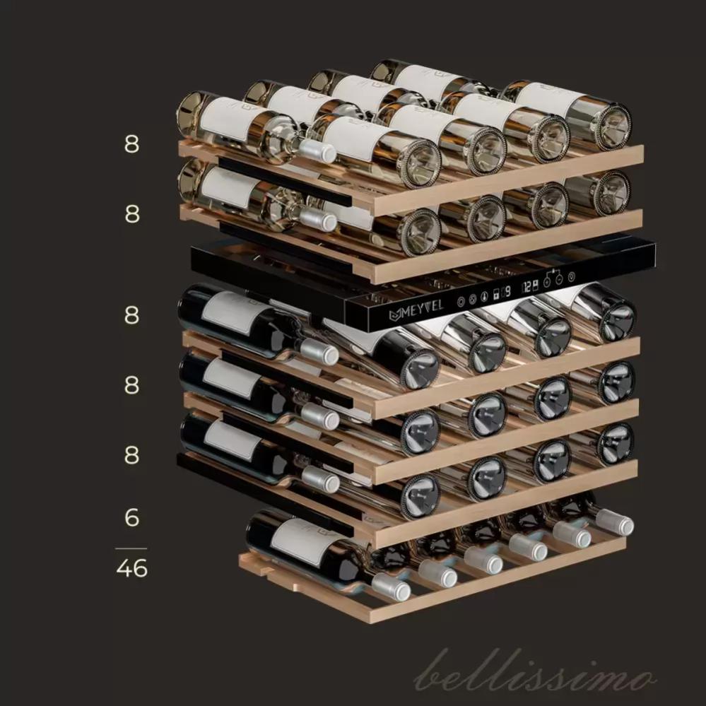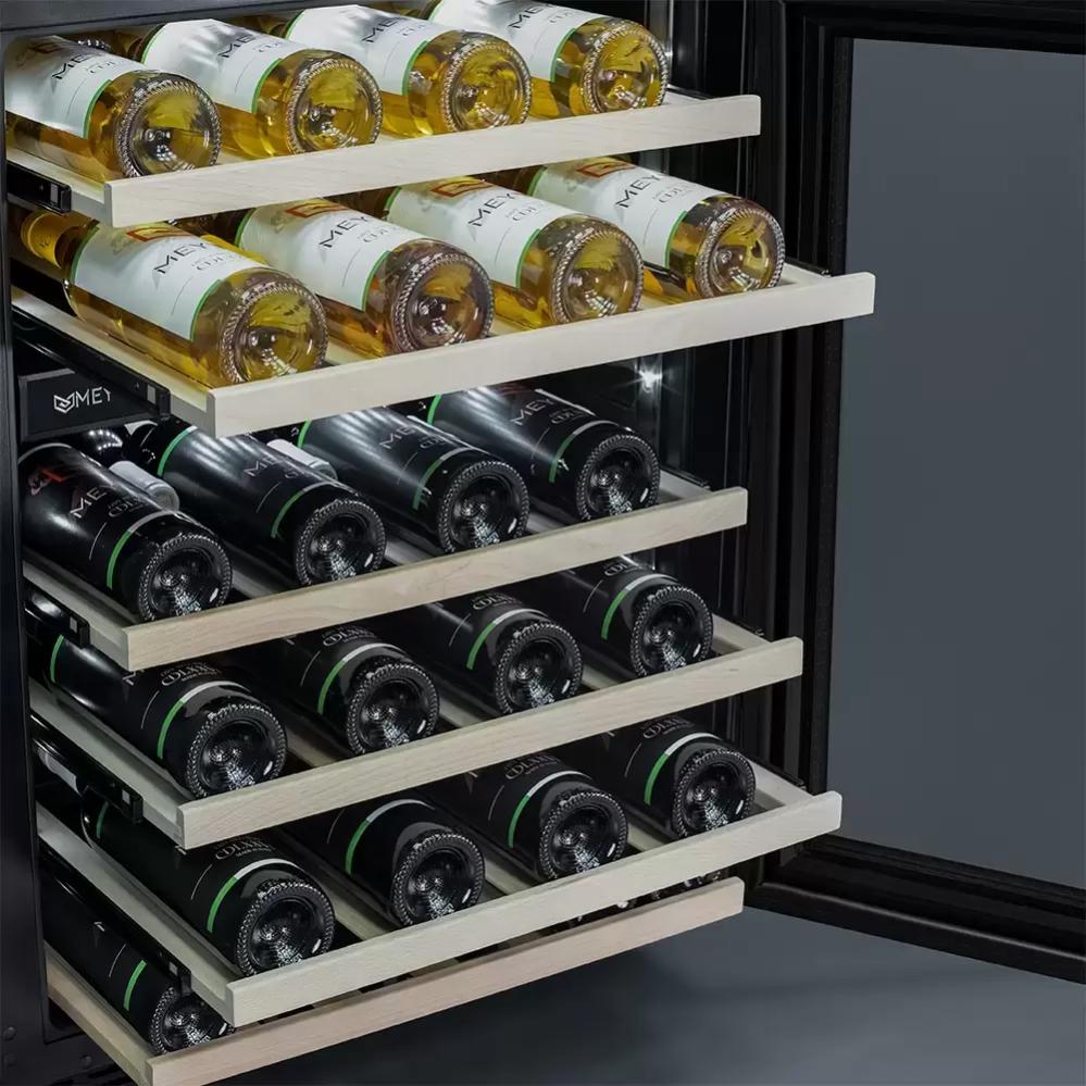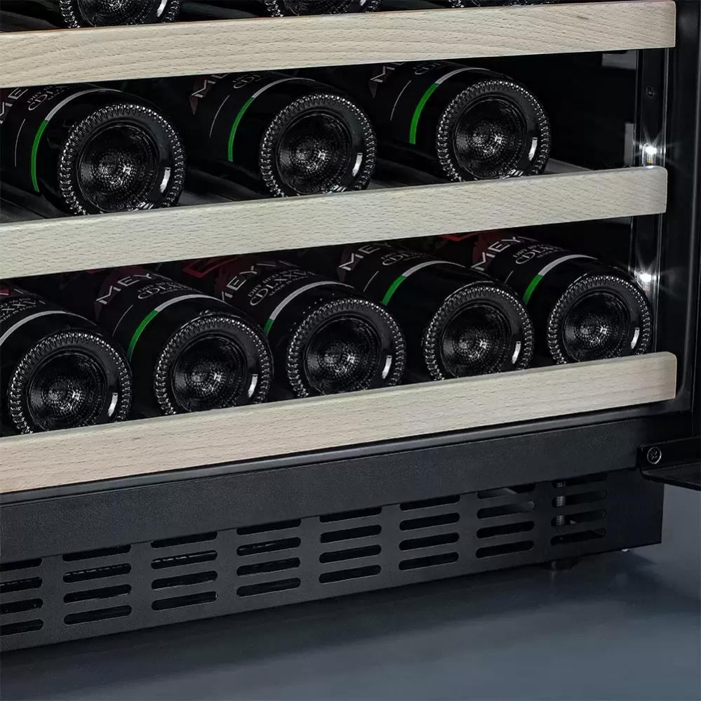 Винный холодильник Meyvel MV46NH-KWT2 имеет две температурные зоны, в которых одновременно можно хранить разные сорта алкоголя и выставлять разные сочетания настроек. Он встраивается в нишу, что удобно, если у вас ограничен метраж помещения. Благодаря компактным размерам данная модель — отличный выбор для офиса, гостиничного номера. Количество бутылок, которое можно разместить с учетом полной комплектации и из расчета объема бутылки 0,75 л, — 46 шт.