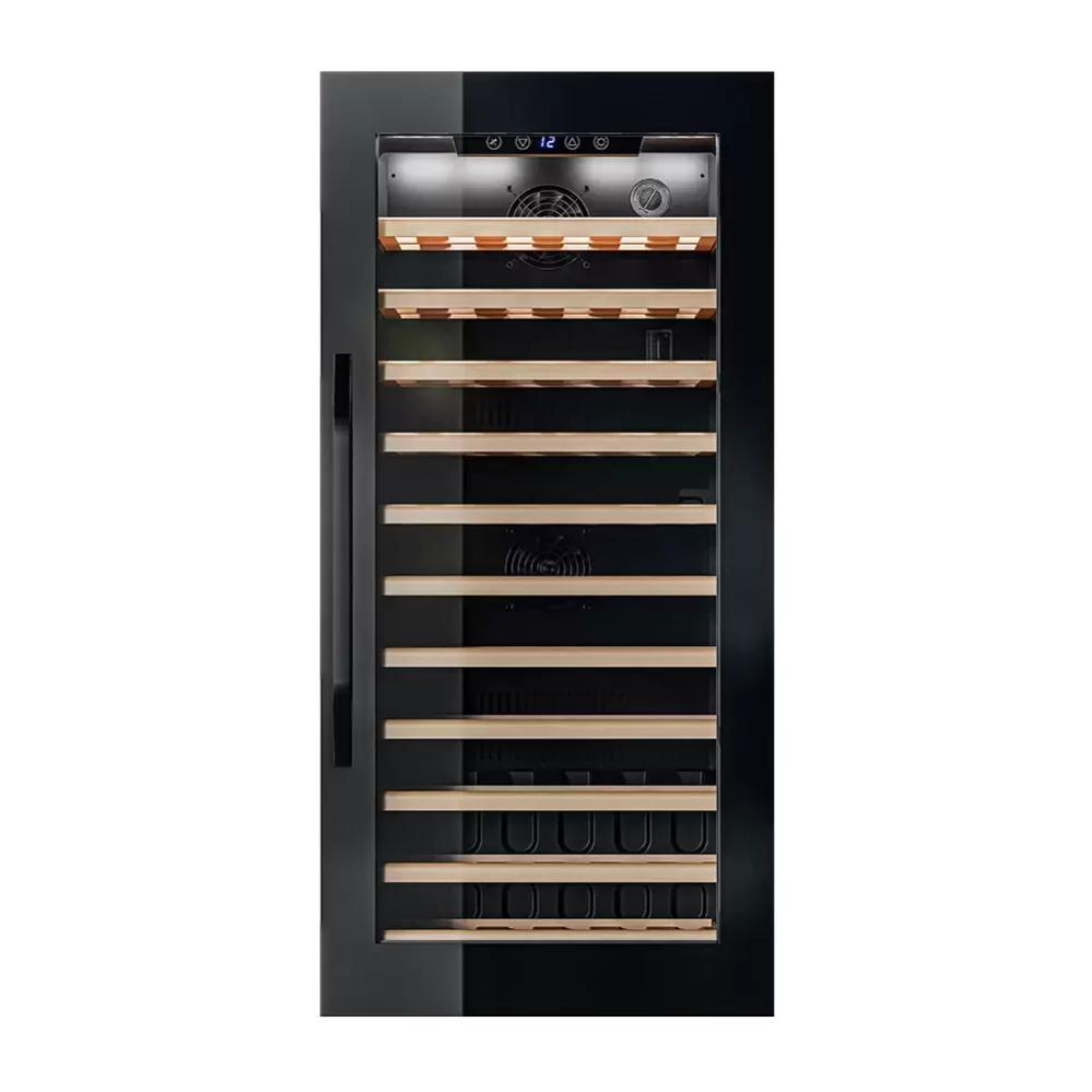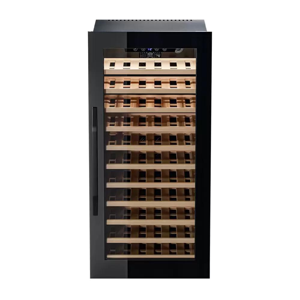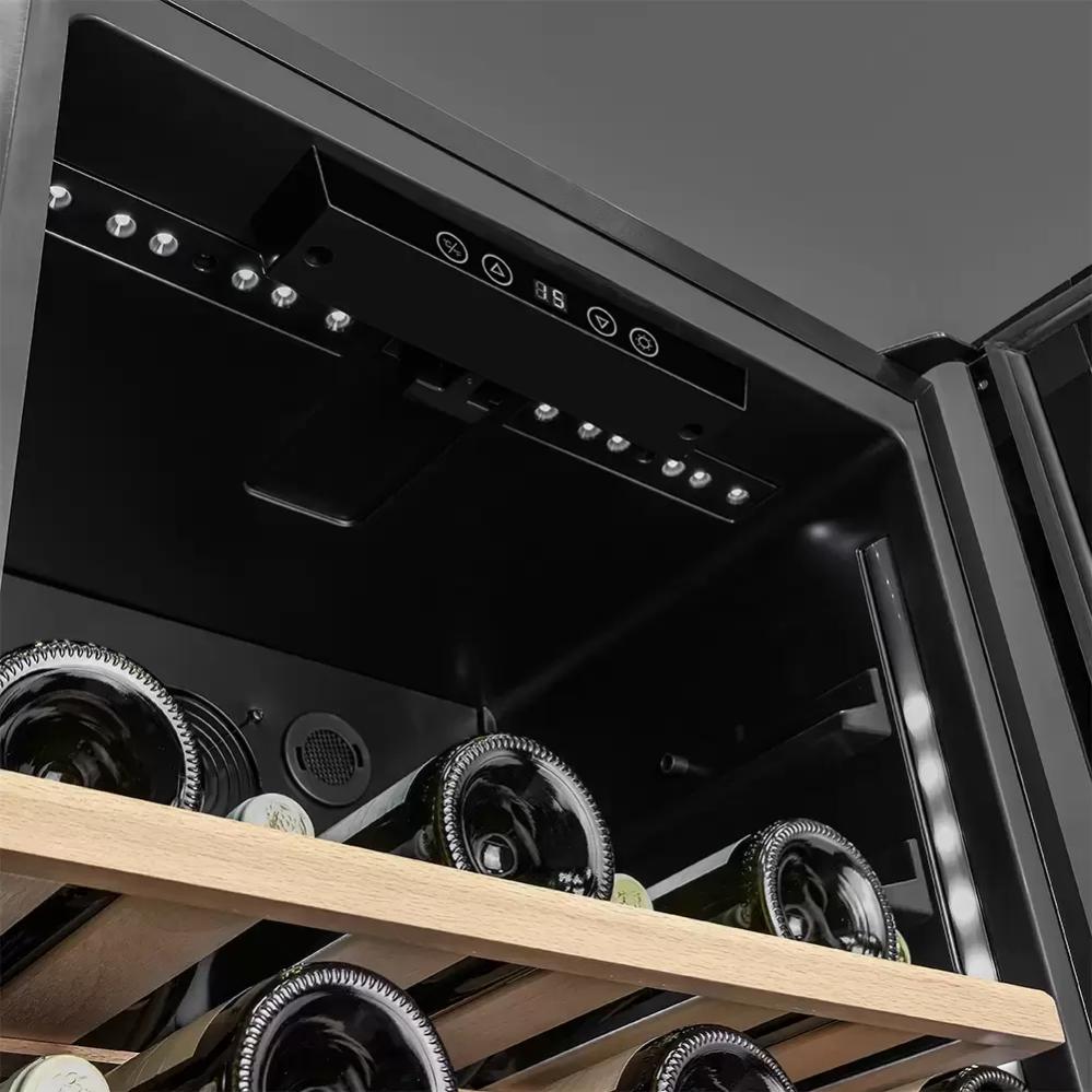 Современные винные шкафы всех типов, в том числе компрессорные, темоэлектрические и абсорбционные, оснащаются электронной системой управления — кнопочной или сенсорной. Панель управления, с помощью которой производится регулировка параметров работы, может размещаться внутри винного шкафа за дверцей или снаружи в верхней части корпуса. Второй вариант более удобен, поскольку для изменения параметров не нужно открывать дверцу. Кроме того, такое расположение панели управления позволяет поддерживать более стабильную температуру в камере. Однако для больших винных шкафов в классическом стиле из ценных пород дерева предпочтительнее скрытая панель управления, которая не портит их внешний вид.