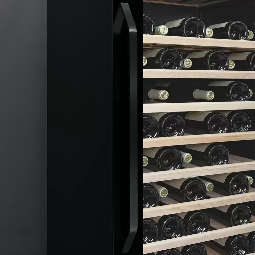 Вид и расположение ручки на дверце винного шкафа зависит прежде всего от дизайна и стиля изделия. В классических холодильниках со корпусом из дерева чаще всего используется внешняя ручка «под старину», изготовленная из металла — например, латуни, под бронзу или медь. Модели в современном стиле оснащаются внешними ручками из металла, выполненными в минималистическом стиле, или скрытыми ручками, создающими снаружи гладкую поверхность, за которой легко ухаживать. Некоторые производители предлагают винные шкафы без ручек: дверца у них открывается нажатием на среднюю или верхнюю часть.