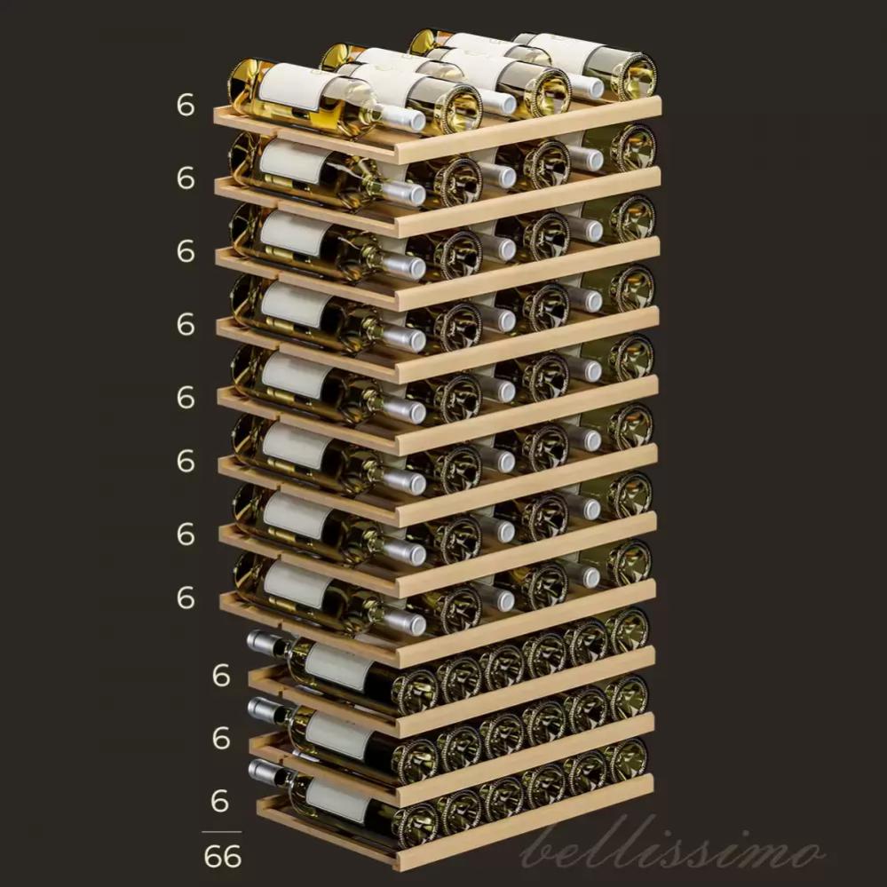Полки в винных шкафах позволяют размещать бутылки для хранения в горизонтальном положении. Это необходимо, чтобы пробка постоянно смачивалась жидкостью и не пересыхала. Плотно закрытая пробка гарантирует, что внутрь бутылки не проникнет наружный воздух. Кислород, содержащийся в воздухе, может стать причиной ухудшения вкуса вина и даже его скисания. Кроме того, горизонтальное положение позволяет лучше оценить количество осадка. Материал изготовления полок выбирается, исходя из требований, предъявляемых к содержанию коллекции вин. Одним из основных требования является отсутствие или максимальное сокращение вибрации и хорошая фиксация бутылок на месте хранения. Даже если полка выдвигается, бутылки должны оставаться на своем месте. Второе требование исключает применение стеклянных полок, как в обычном холодильнике: на них почти невозможно зафиксировать бутылки.