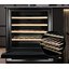 Встраиваемые холодильники для вина оснащаются специальной системой вентиляции: охлаждающая система у них находится в нижней части корпуса спереди. На такие устройства не навешивается мебельный фасад: дверца с затемненным стеклом остается на виду и открывается на достаточно широкий угол для свободного выдвижения деревянных полок.