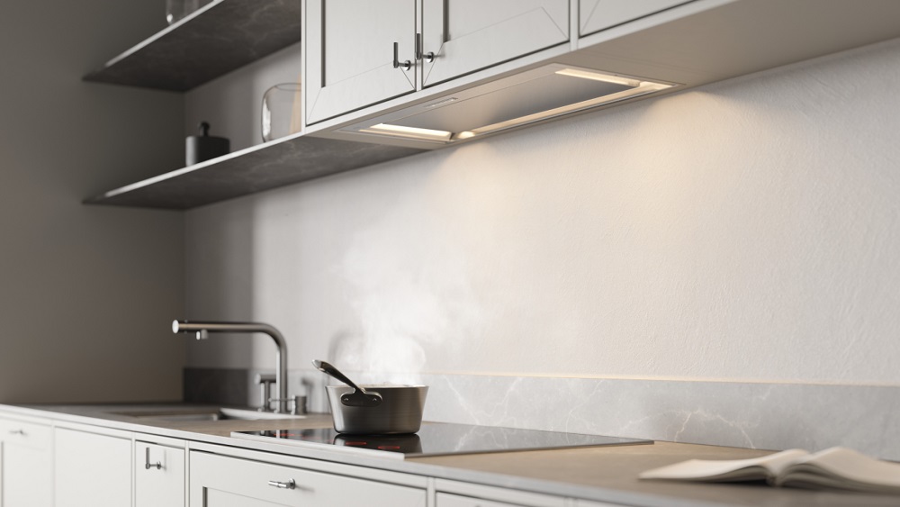 Вытяжки, встраиваемые в столешницу — эффективная инновация, которая подойдет для установки в кухне любой площади. Такие вытяжки размещаются за варочной поверхностью или рядом с ней. В отключенном состоянии всасывающая панель находится под столешницей, но после включения одной или нескольких конфорок она автоматически выдвигается при помощи специального лифтового механизма. Загрязненный воздух улавливается, не успевая распространиться по помещению. Когда вытяжка убрана, на виду остается только сенсорная панель управления. Недостатком подобных моделей является только сравнительно высокая цена.