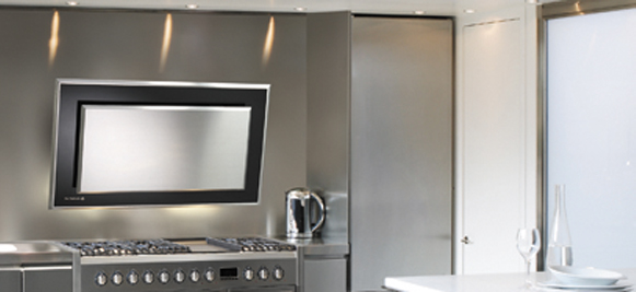 Воздух всасывается по периметру вытяжки через узкие щели. Он собирается в потоки, которые направляются прямо к фильтрам внутри, не рассеивается на кухне. Благодаря этой технологией вытяжку можно сделать компактнее и энергоэффективнее.