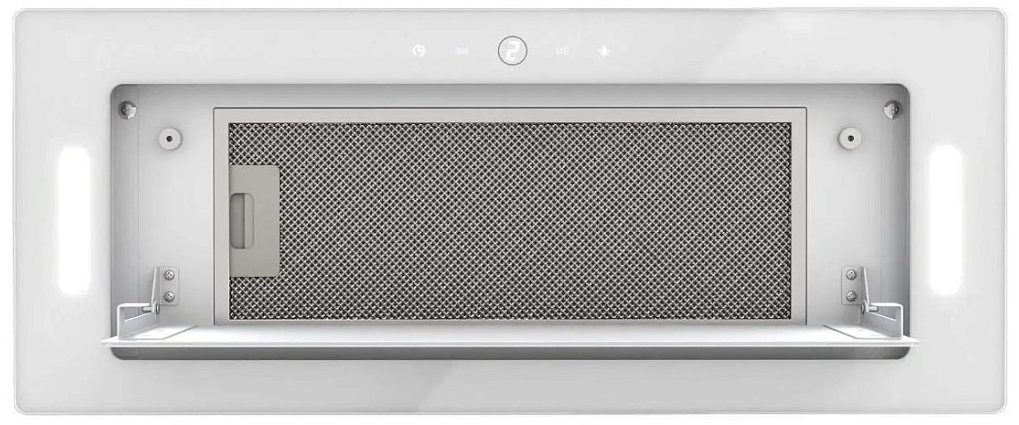 Воздух всасывается по периметру вытяжки через узкие щели. Он собирается в потоки, которые направляются прямо к фильтрам внутри, не рассеивается на кухне. Благодаря этой технологией вытяжку можно сделать компактнее и энергоэффективнее.