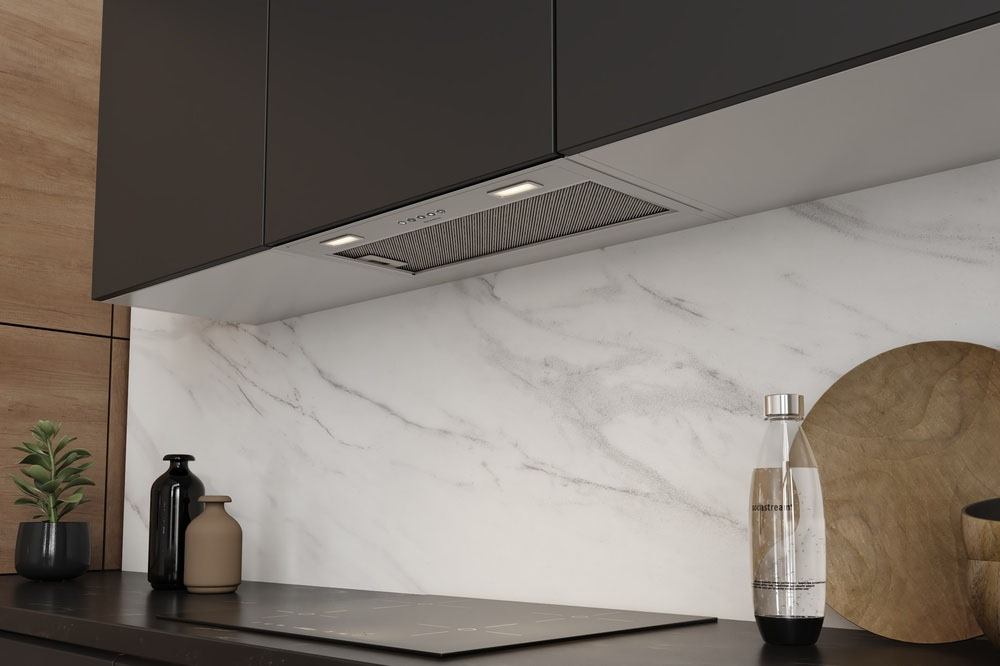 Встраивание вытяжки в шкаф — оптимальный вариант для малогабаритной кухни. Такие модели просты в установке, недороги, практически скрыты от глаз, их не нужно подбирать по внешнему виду, а также чем-то маскировать воздуховод. Уровень шума также снижается благодаря дополнительной звукоизоляции. Встроенные в шкаф модели могут дополняться выдвижной панелью, которая увеличивает площадь забора загрязненного воздуха. Иногда к встраиваемым относят также вытяжки, которые монтируются под подвесной шкаф, хотя их корпус остается на виду.