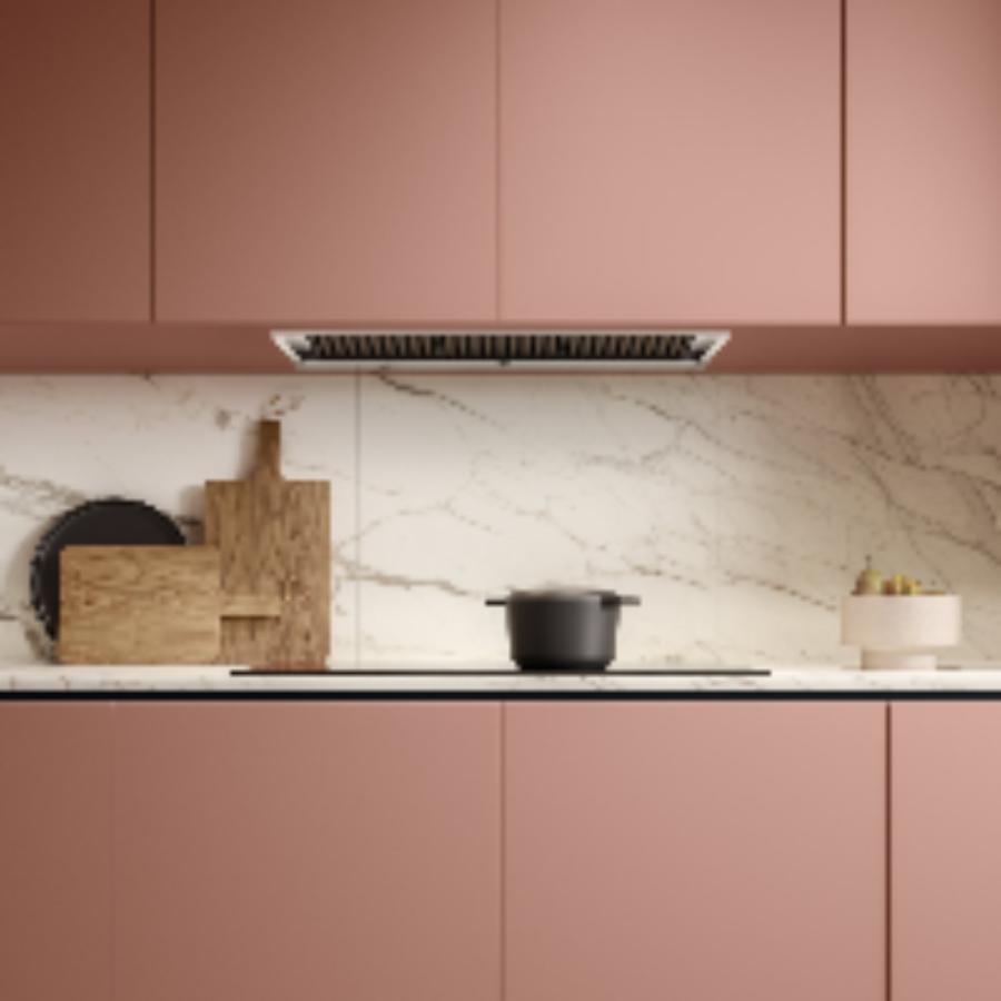 Формат органично вписывается в гарнитур: панель скрыта в шкафу, рабочая зона подсвечена, запахи выводятся по выбранной схеме.