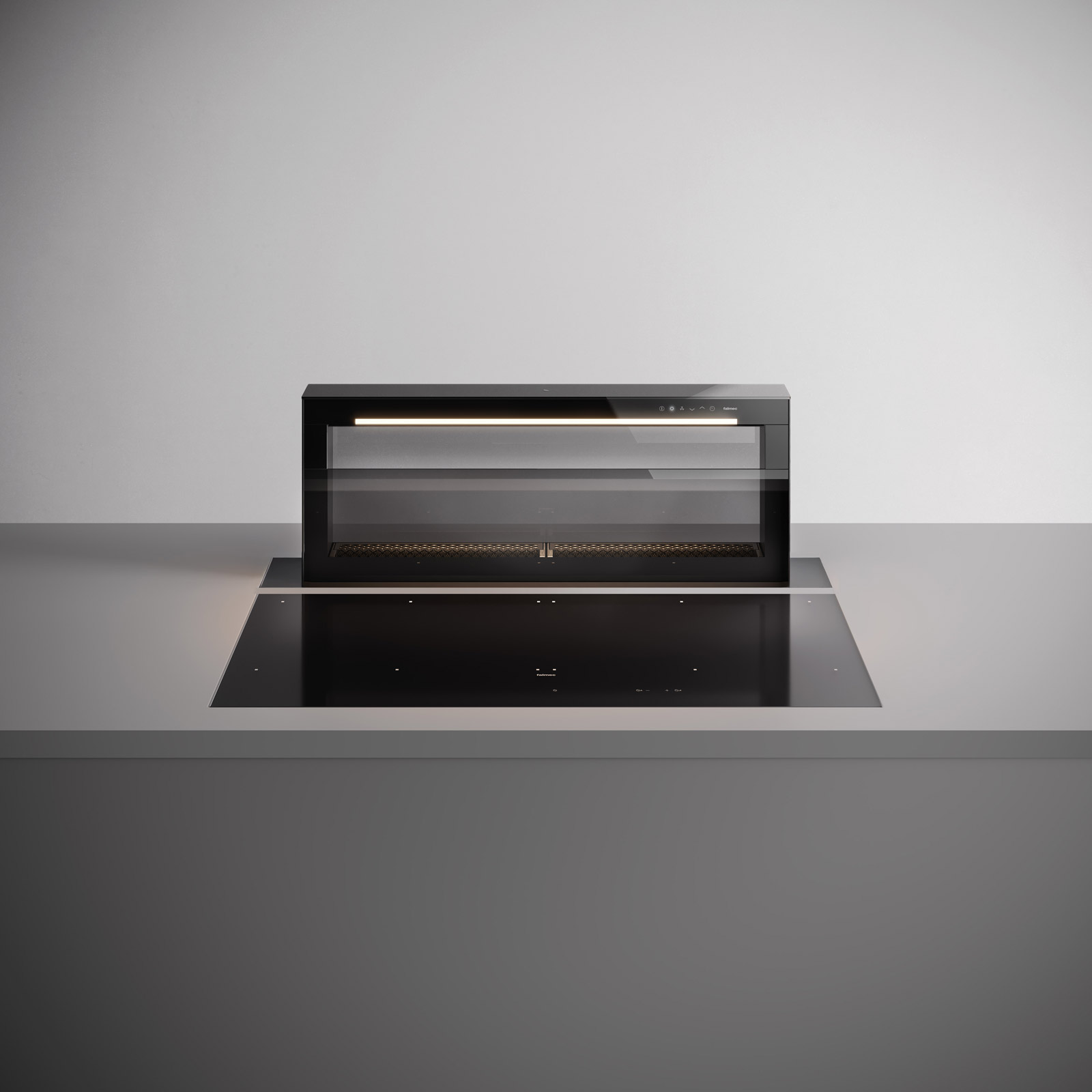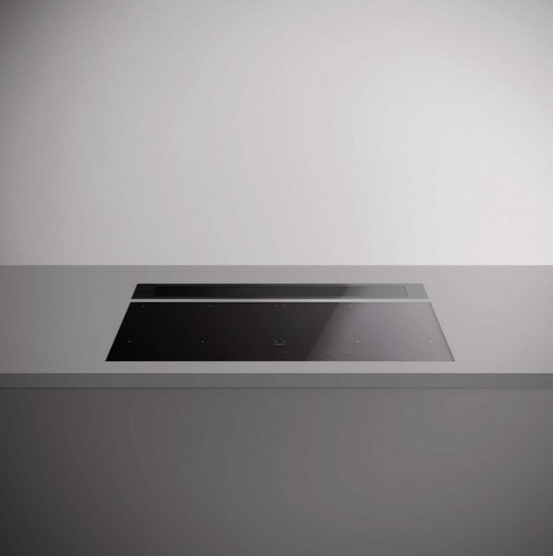 В вытяжках, интегрированных в варочную поверхность и работающих в режиме рециркуляции, панель выдвигается при включении зоны нагрева автоматически. В закрытом же состоянии видны только сенсорные управляющие элементы, которые находятся вровень с варочной поверхностью.
