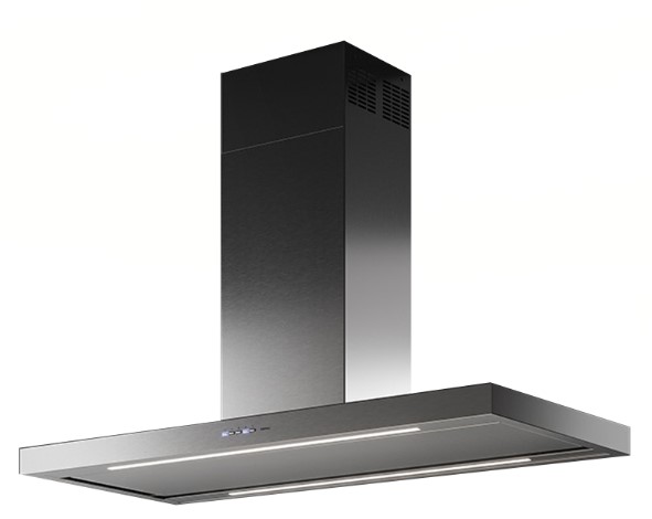 Островная вытяжка выглядит как строгая стальная панель формата 90×55 см. Корпус из нержавеющей стали с ровной геометрией подчеркивает симметрию островной зоны. Высота 123,5 см придает конструкции законченный вид, а фронтальные кнопки читаются с любого угла. Два светодиодных источника равномерно освещают рабочую поверхность.