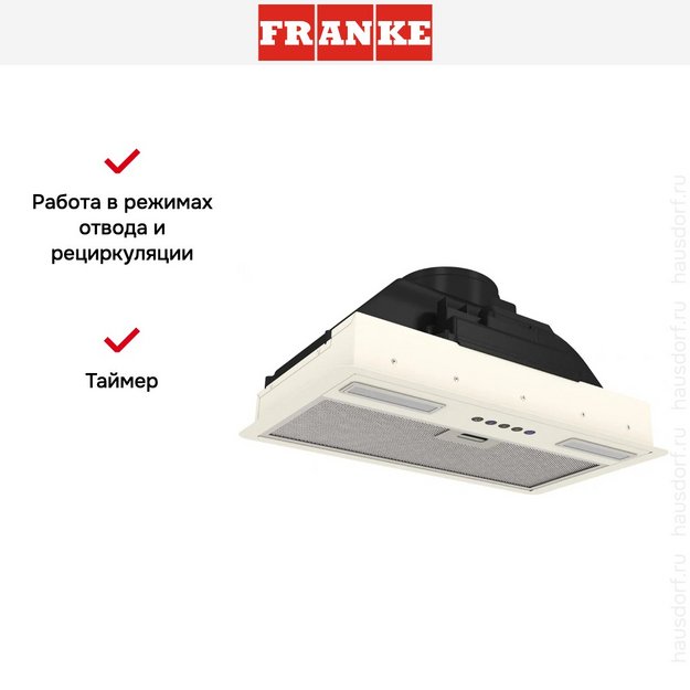 Встраиваемая вытяжка — выбор тех, кто хочет максимально задекорировать технику, или владельцев маленькой кухни. Тип встраивания: в шкаф. Обратите внимание на цветовые сочетания модели Franke FLICK 60 BG, чтобы органично вписать ее в свою квартиру. Оттенок корпуса: бежевый. Благодаря лампочкам, которые расположены на нем, можно освещать плиту и столешницу рядом, чтобы готовить было еще проще и приятнее.