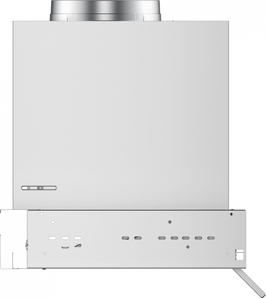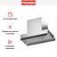 По функционалу это вытяжка для работы в режиме отвода и рециркуляции, оборудованная одним мотором мощностью 250 Вт. Управление электронное, кнопочное, вынесено на боковую панель — выбор из трёх скоростей прост и нагляден; при необходимости есть интенсивный режим с производительностью до 670 м3/ч. В обычных режимах прибор обеспечивает 290 и 440 м3/ч, а максимальная производительность достигает 570 м3/ч. Диаметр подключения к воздуховоду — 150 мм.