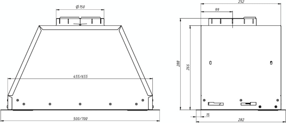 У многих встраиваемых моделей глубина может регулироваться, а рабочая всасывающая поверхность — увеличиваться благодаря выдвижному козырьку, но габариты корпуса такой вытяжки должны соответствовать размерам подвесного шкафа. Выбирать основные размеры вытяжки с соблюдением всех требований эффективности и безопасности работы следует также не в ущерб общему дизайну помещения.