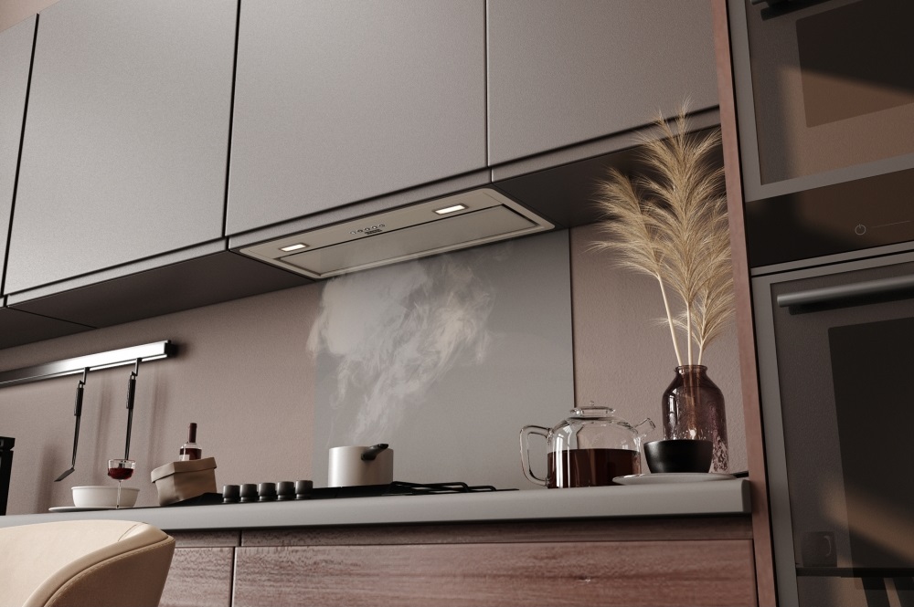 Вытяжка устанавливается в шкаф или в потолочную нишу — таким образом все соединительные элементы и корпус оказываются скрыты. Это подходящий вариант для небольшого помещения, если нужно максимально освободить пространство, а также необходимость, если вы продумываете кухонный дизайн до мелочей.