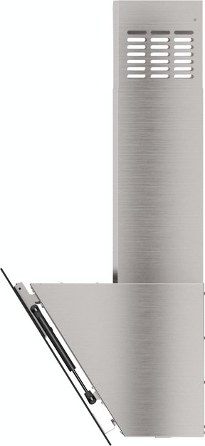 Воздух всасывается по периметру вытяжки через узкие щели. Он собирается в потоки, которые направляются прямо к фильтрам внутри, не рассеивается на кухне. Благодаря этой технологией вытяжку можно сделать компактнее и энергоэффективнее.