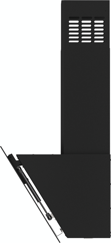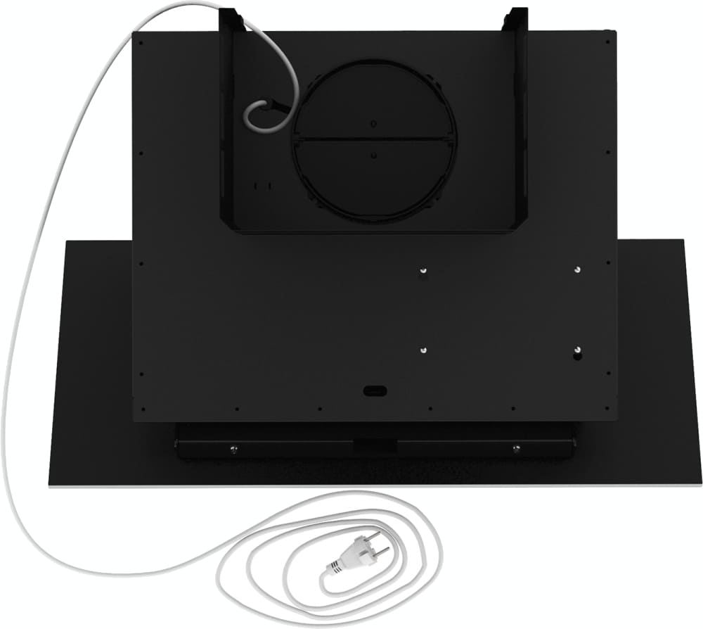 Выглядит как наклонная вытяжка с выразительным стеклянным экраном и корпусом черного цвета в духе линии Maris. Компактные габариты 81.9×59×41.4 см (максимальная высота до 120 см) делают модель заметной, но не громоздкой: она поднимает визуальную ось кухни вверх благодаря наклонной плоскости экрана. Передняя панель с сенсорными органами управления расположена фронтально, что упрощает доступ и придает фасаду аккуратный, собранный вид.