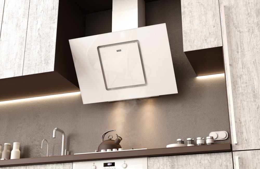 Наклонные модели — еще один вариант для небольшой кухни. Они размещаются на стене, но при высокой производительности не требуют много места. Их особенностью считается пониженный уровень шума и управление при помощи пульта ДУ. Эта категория вытяжек отличается большим разнообразием размеров, дизайна, цветов.