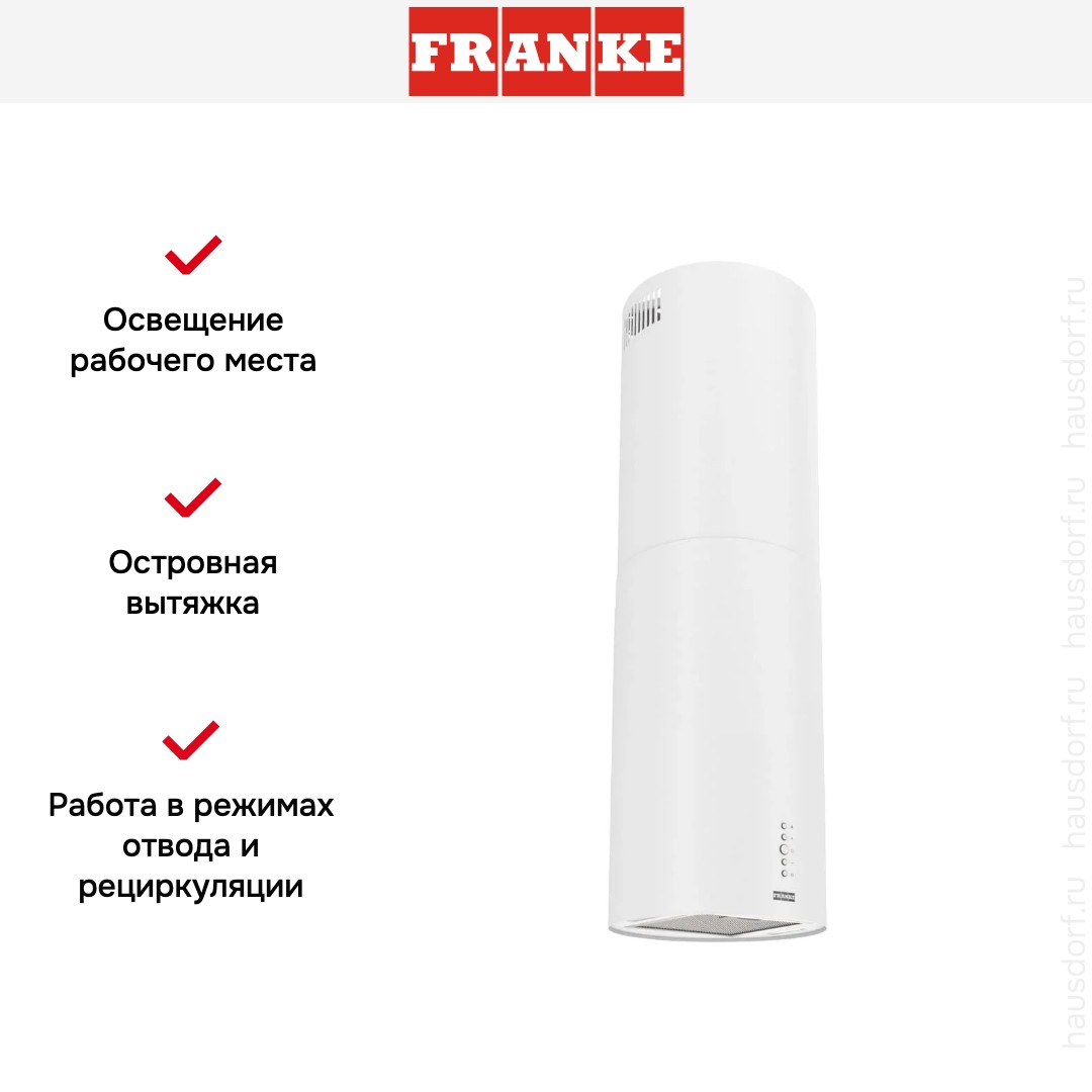 Вытяжка Franke Reef 35 WH. Это компактный и аккуратный прибор, который вписывается в современные кухни с ограниченным пространством. Корпус выполнен в белом исполнении с гладкой фронтальной панелью, что придаёт интерьеру лёгкость и чистоту. Минималистичная геометрия не перегружает рабочую зону и сочеталась бы с фасадами разных стилей, от скандинавских до хай‑тек.