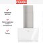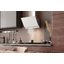 Выглядит как наклонная панель с изящной фронтальной поверхностью: сочетание нержавеющей стали и стекла формирует ровную белую композицию в духе дизайна Maris. Габариты 73,2-120 × 49 × 43,2 см придают вытяжке компактность по ширине и глубину, а регулируемая высота до 120 см позволяет подстроить прибор под разную установку. Передняя часть со сенсорными элементами управления располагается так, чтобы команды были на виду и в легком доступе, а перфорированная стальная пластина над фильтрующим блоком завершает визуальный ряд функциональными деталями.