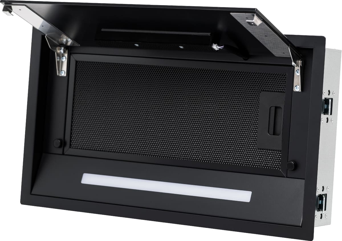 Вытяжки, встраиваемые в столешницу — эффективная инновация, которая подойдет для установки в кухне любой площади. Такие вытяжки размещаются за варочной поверхностью или рядом с ней. В отключенном состоянии всасывающая панель находится под столешницей, но после включения одной или нескольких конфорок она автоматически выдвигается при помощи специального лифтового механизма. Загрязненный воздух улавливается, не успевая распространиться по помещению. Когда вытяжка убрана, на виду остается только сенсорная панель управления. Недостатком подобных моделей является только сравнительно высокая цена.