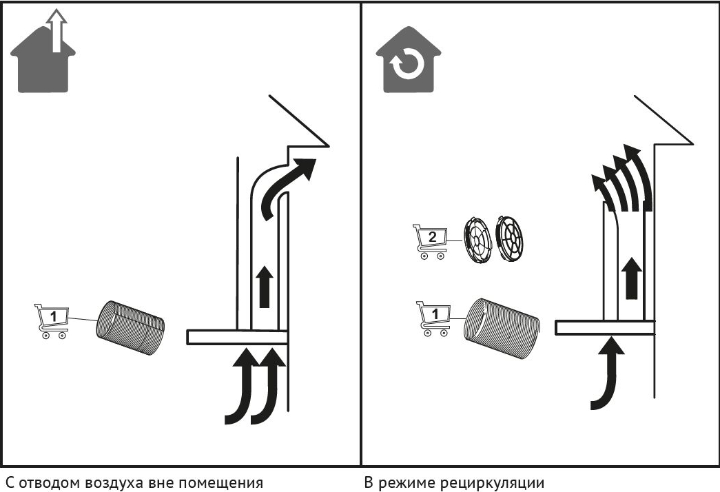 Циркуляция — воздух проходит через угольные и жироулавливающие фильтры, очищается и возвращается в комнату. Для активации этого режима в большинстве моделей нужно устанавливать угольный фильтр отдельно.