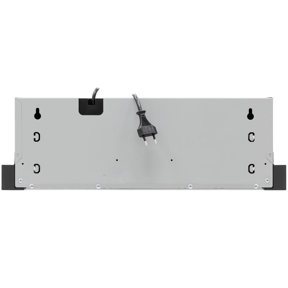 Управление электронное, кнопочное, расположено спереди — это облегчает доступ при работе с выдвижной панелью. Длина кабеля 1.5 м и наличие вилки в комплекте упрощают подключение без дополнительных переходников. Рекомендованные высоты установки: 65 см над газовой поверхностью и 50 см над электрической, что обеспечивает безопасность и оптимальную производительность.