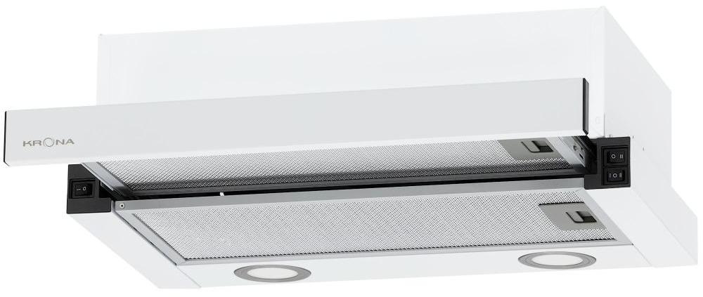 Встраиваемая вытяжка — выбор тех, кто хочет максимально задекорировать технику, или владельцев маленькой кухни. Тип встраивания: в шкаф. Обратите внимание на цветовые сочетания модели KRONA KAMILLA MV 500 WHITE, чтобы органично вписать ее в свою квартиру. Оттенок корпуса: белый. Благодаря лампочкам, которые расположены на нем, можно освещать плиту и столешницу рядом, чтобы готовить было еще проще и приятнее. Фишка этой техники — выдвижная панель.