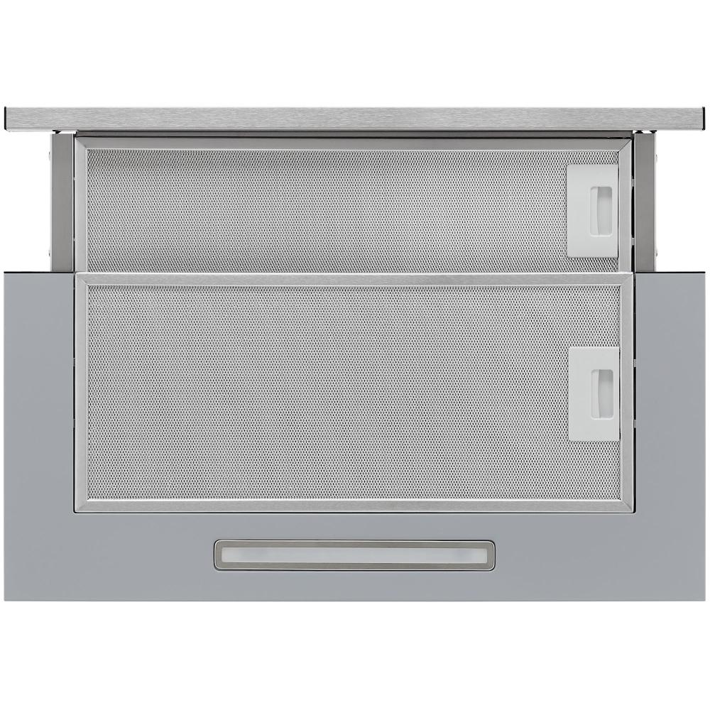 В вытяжках, интегрированных в варочную поверхность и работающих в режиме рециркуляции, панель выдвигается при включении зоны нагрева автоматически. В закрытом же состоянии видны только сенсорные управляющие элементы, которые находятся вровень с варочной поверхностью.