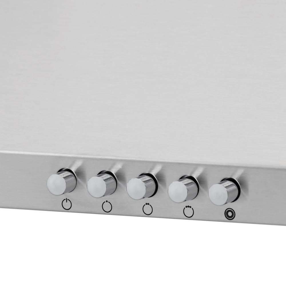 Встраиваемые и простые настенные модели, как правило, оснащаются боковой панелью управления, состоящей из нескольких кнопок. Их количество зависит от числа скоростей, наличия интенсивного режима и встроенного освещения. Боковое расположение панели управления делает вытяжку еще более незаметной.