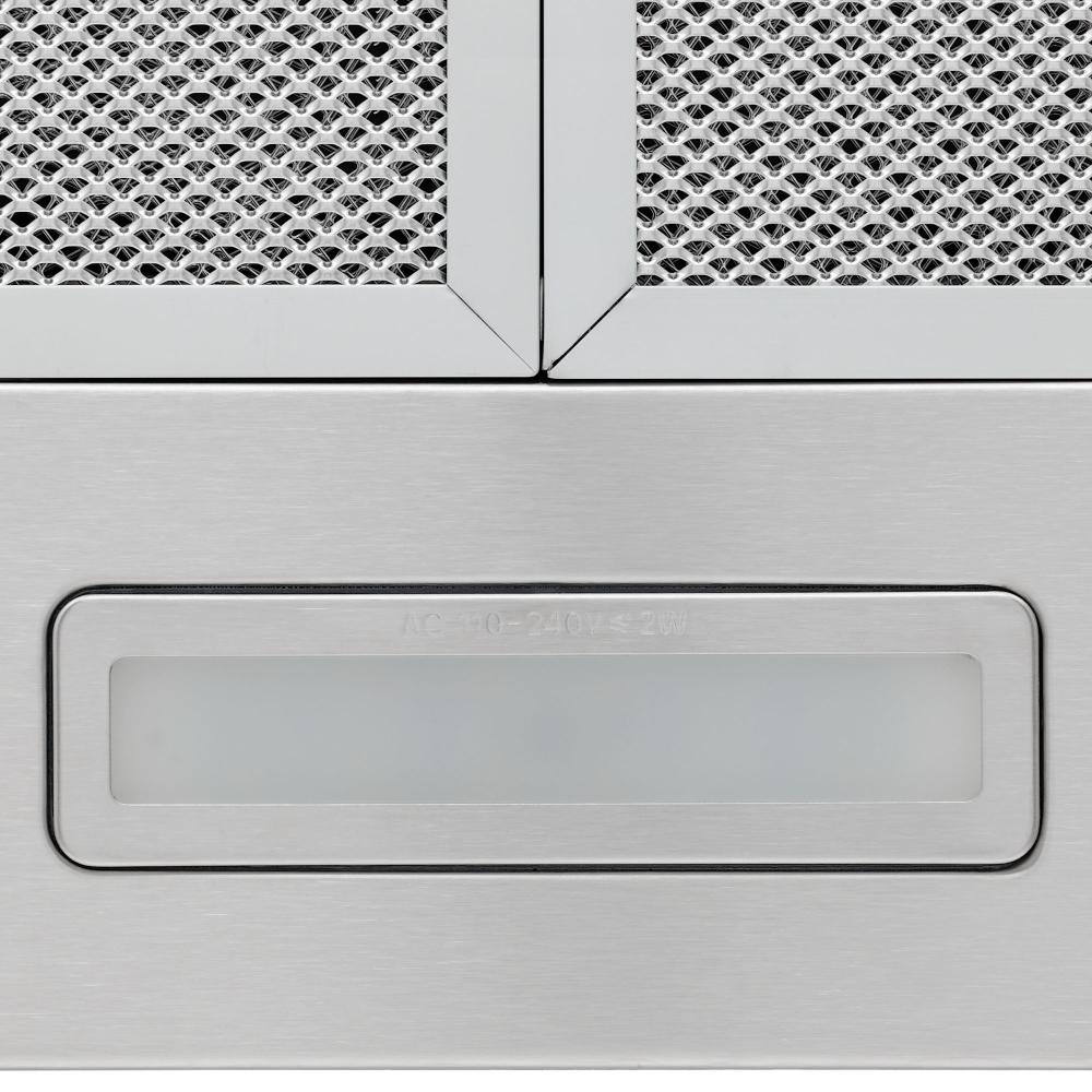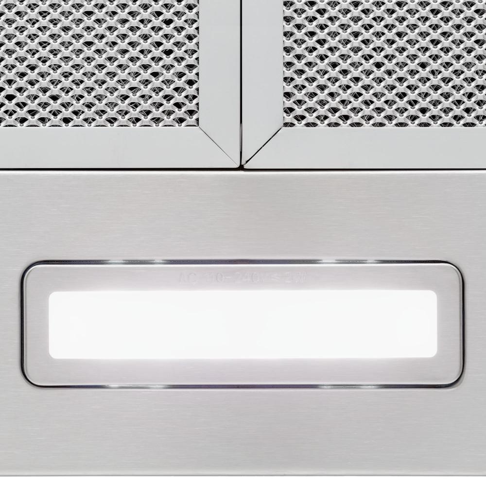 Устройство оснащено двумя алюминиевыми жироулавливающими фильтрами, которые задерживают крупные частицы жира и продлевают срок службы мотора. Эти кассеты легко снимаются и моются, что экономит время и средства на обслуживание. При работе в режиме циркуляции предусмотрена возможность установки двух угольных фильтров типа TK, они эффективно нейтрализуют запахи и делают воздух в помещении свежее. Светодиодная подсветка рабочего места состоит из двух ламп по 2 Вт, даёт яркий и равномерный свет над варочной поверхностью и экономит электроэнергию.