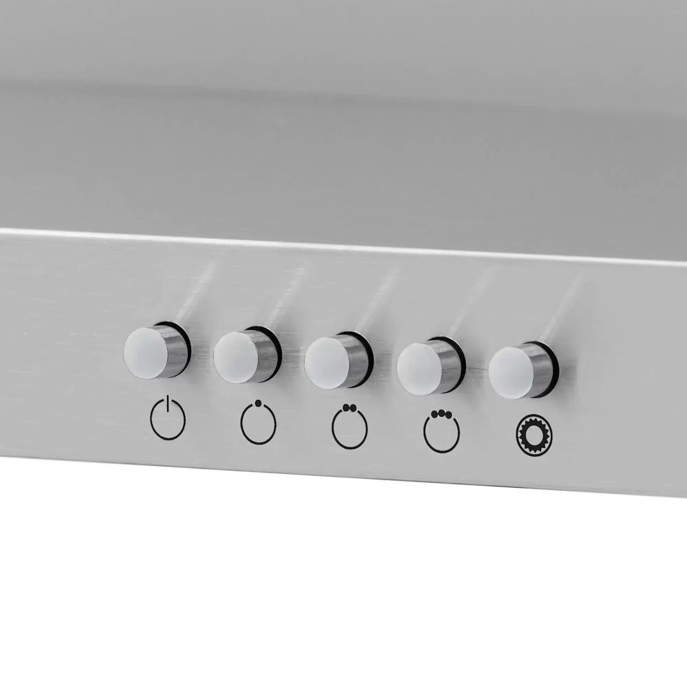 Наиболее распространенным элементом управления являются кнопки — ими оснащаются устройства с механическим управлением. Кнопки можно увидеть у вытяжек всех типов, от простых встраиваемых до дизайнерских подвесных, островных или наклонных. Количество кнопок зависит от набора функций: в простейшем случае достаточно всего трех кнопок — двух для переключения скоростей и одной для включения освещения. Как правило, они имеют круглую форму, однако производители предлагают устройства с квадратными и даже треугольными кнопками. В больших купольных вытяжках кнопки могут изготавливаться из меди, бронзы или латуни, а моделях современного дизайна — оснащаться подсветкой.