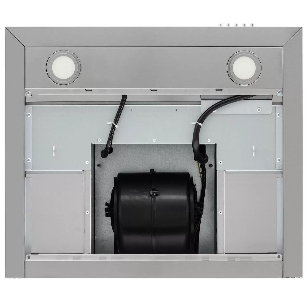 Вытяжка работает в режимах отвода и циркуляции, поэтому загрязнения удаляются из комнаты и перенаправляются в воздуховод, при этом можно очистить воздух и использовать повторно за счет возвращения его в помещение. Количество скоростей в этой модели: 3 шт. При этом максимальная производительность составляет 650 куб.м./ч. Уровень шума при полной загруженности — 62 дБ.